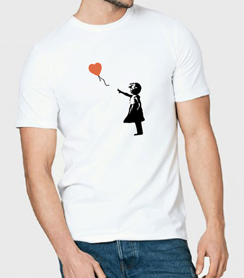 Perhaps the best known Banksy street art image, the young girl with a heart shaped balloon is featured on this cotton t shirt. Voted the nation's most popular piece of artwork in 2017, the design is set on a classic Jersey cotton t-shirt. It's in white in a choice of sizes.