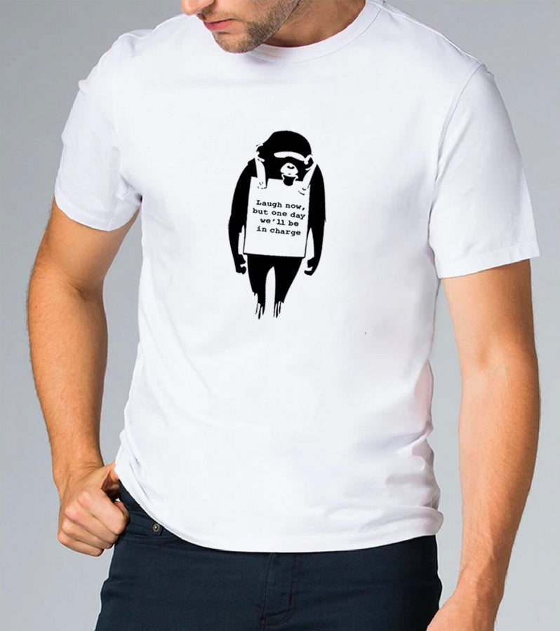 A well known Banksy graffiti image, Laugh Now Monkey is featured on this cotton t shirt. The design is set on a classic Jersey cotton t-shirt. It's in white in a choice of sizes.