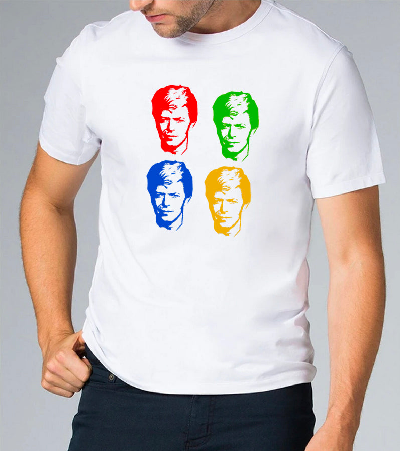 New David Bowie multicoloured design tee. The exclusive design is set on a classic Jersey cotton t-shirt. It's available in white and in a choice of sizes.
