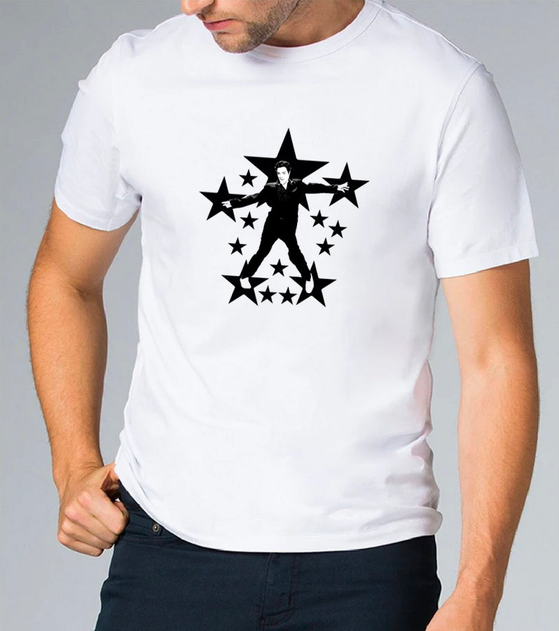 The Elvis Presley star design t-shirt pays homage to the legendary rock 'n' roll icon. With a striking black and white graphic of Elvis, it captures his charismatic stage presence. The design showcases his iconic hairstyle, signature sideburns, and stylish outfit. The star in the background symbolises his status as a music superstar. Made from comfortable, high-quality cotton fabric, this t-shirt is a must-have for any Elvis fan. It's a timeless piece of merchandise that celebrates the enduring legacy of the King of Rock 'n' Roll, allowing fans to express their admiration for his music and style. It's available in white and in a choice of sizes.