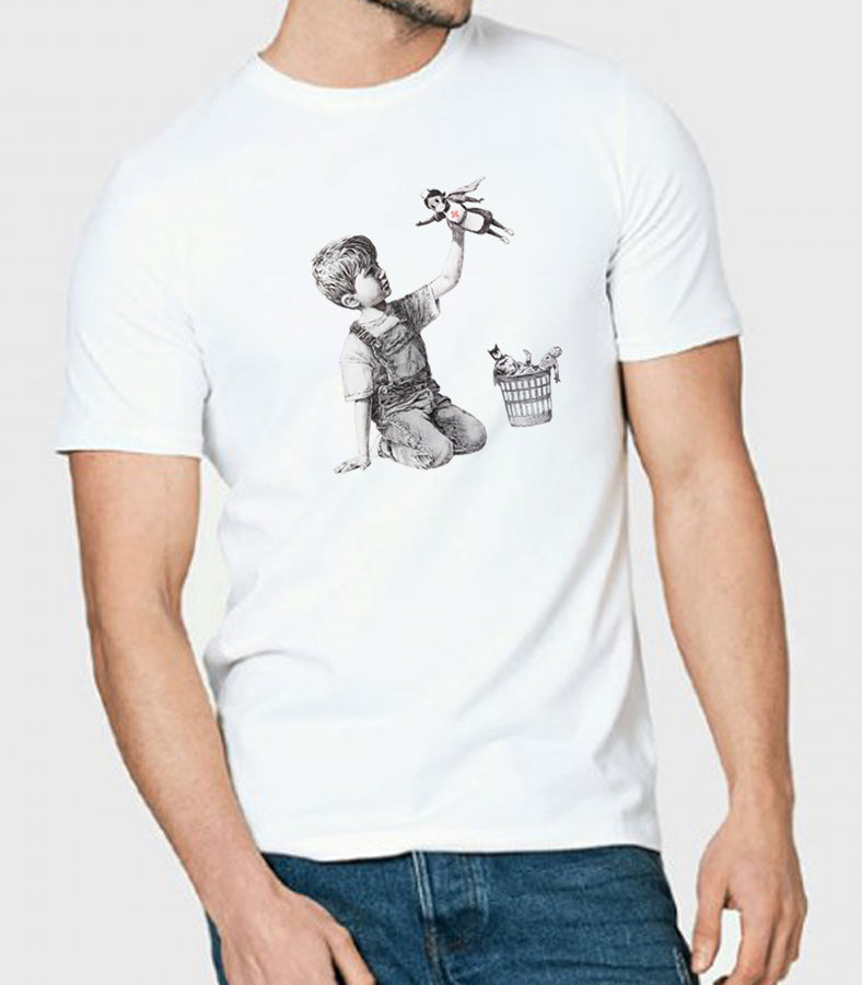 The Banksy "Game Changer" t-shirt is a powerful and thought-provoking piece of art that encapsulates the spirit of our times. Created by the anonymous street artist Banksy, the t-shirt features a young boy playing with a nurse superhero toy, while traditional superhero figures like Batman and Spider-Man sit neglected in a wastebasket. This image serves as a poignant commentary on the COVID-19 pandemic and pays tribute to the real-life heroes working on the frontlines. The "Game Changer" t-shirt has become an iconic symbol, representing resilience, gratitude, and the need to revaluate our societal priorities. It stands as a wearable reminder of the extraordinary times we live in. The design is set on a classic Jersey cotton t-shirt. It's in white in a choice of sizes.