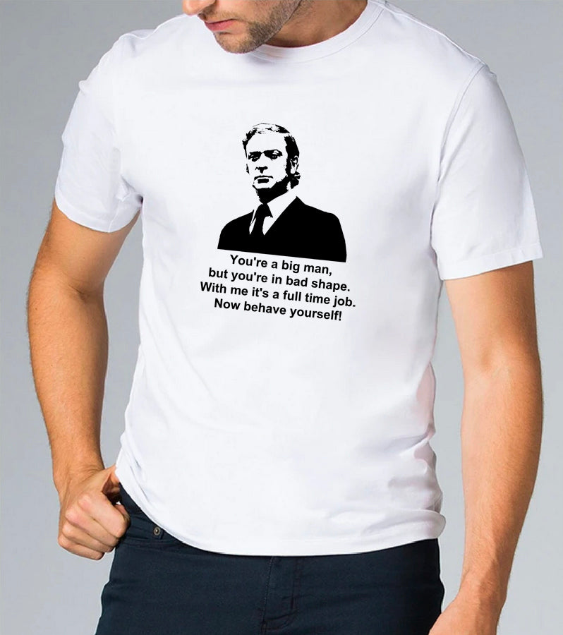 Ask someone to do a Michael Caine impression and they'll probably say something about blowing the bloody doors off. If you're up to a challenge try this line from the 1971 British cult classic Get Carter ..."You're a big man, but you're in bad shape. With me it's a full time job. Now behave yourself". It's available in white or sports grey and in a choice of sizes.