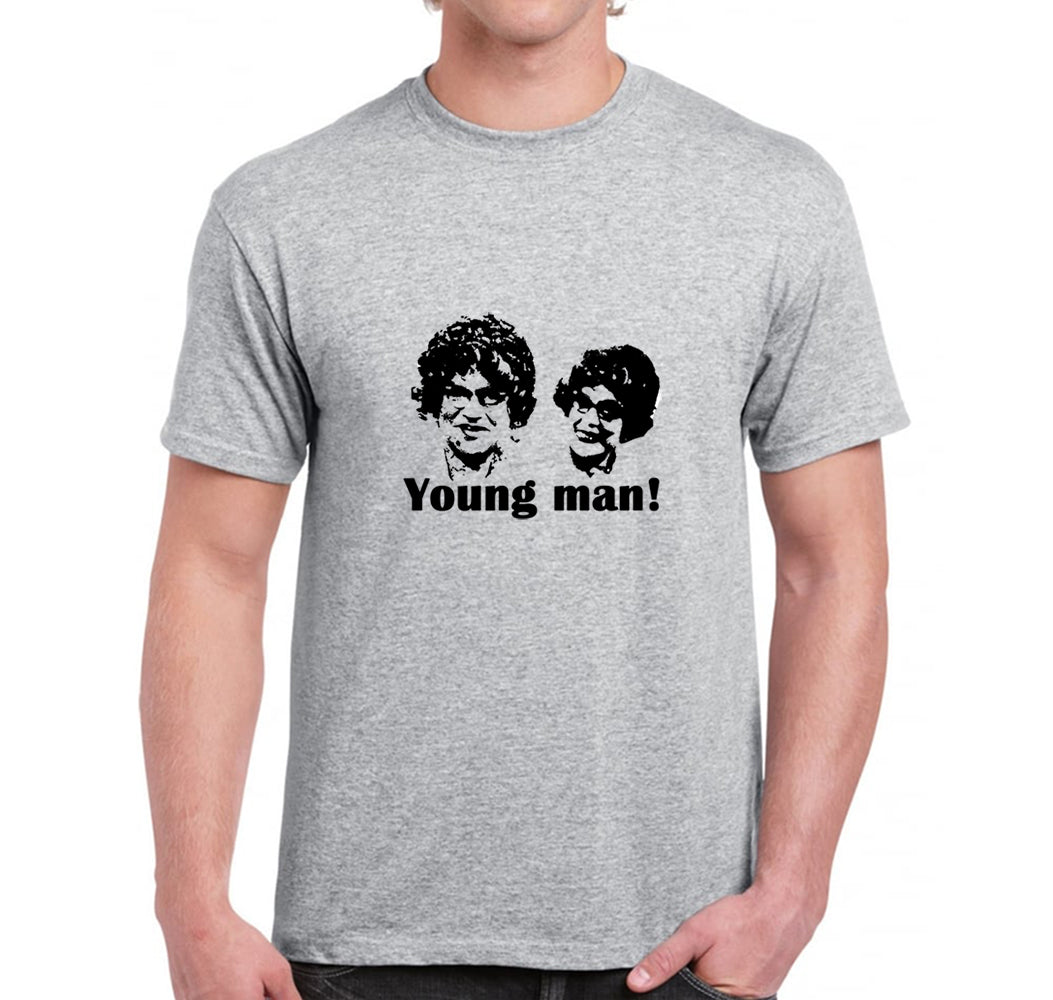 For all Harry Enfield fans, here's Gladys and Hilda with there famous young man quote from Harry Enfield and Chums series. The exclusive design is set on a classic Jersey cotton t-shirt. It's available in sports grey and in a choice of sizes.