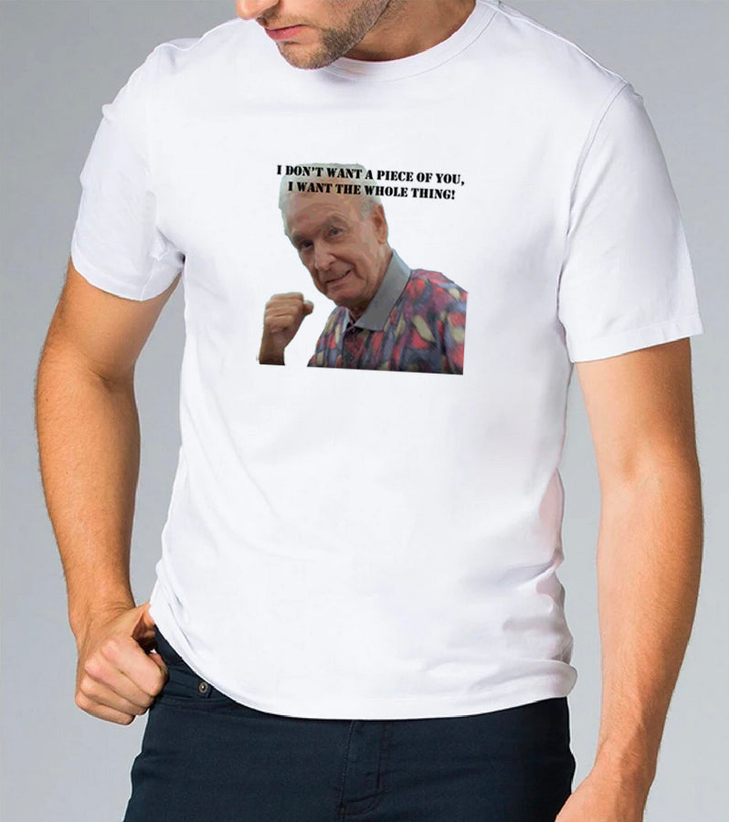 I don't want a piece of you, I want the whole thing. One of the many memorable lines from Adam Sandler's movie, Happy Gilmore. This unique design is set on a classic Jersey cotton t-shirt. It's in white in a choice of sizes.