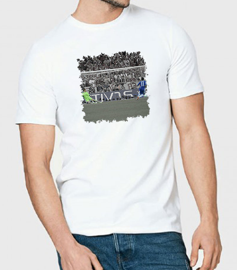 Possibly one of modern day footballs most dramatic spot kicks, the winning penalty from Chelsea Legend Didier Drogba in the 2012 Champion's League final against favourites and hosts Bayern Munich is captured here on a new and original print. The exclusive design is set on a classic Jersey cotton t-shirt. It's available in white and in a choice of sizes.