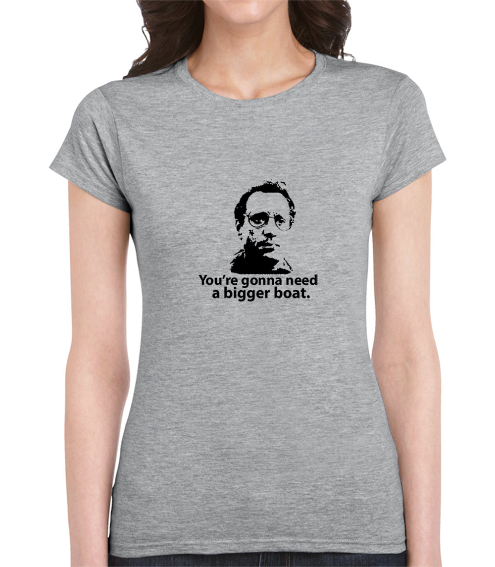 Jaws Chief Martin Brody quote (You're gonna need a bigger boat.) This quote is set on a classic Jersey cotton t-shirt. It's available in sports grey and in a choice of sizes.