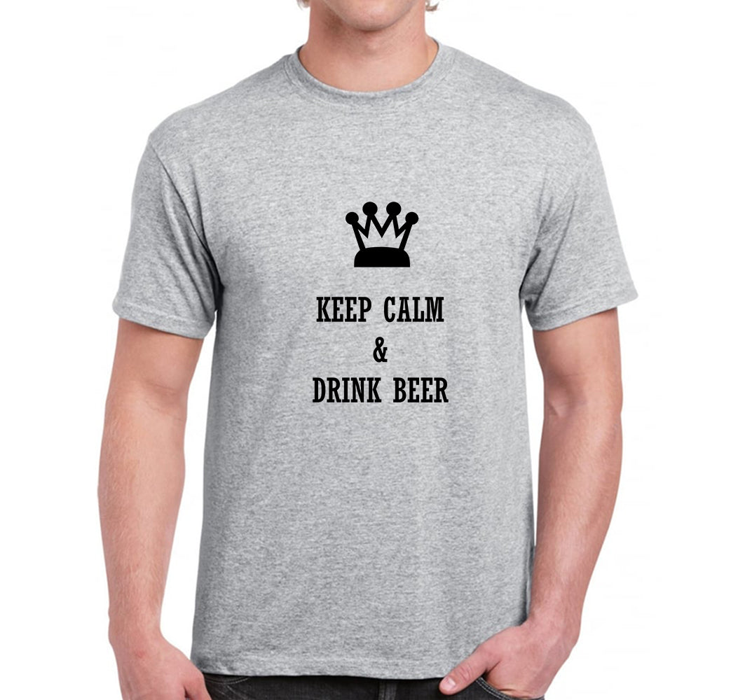 Keep Calm & Drink Beer T Shirt. The exclusive design is set on a classic Jersey cotton t-shirt. It's available in sports grey and in a choice of sizes.