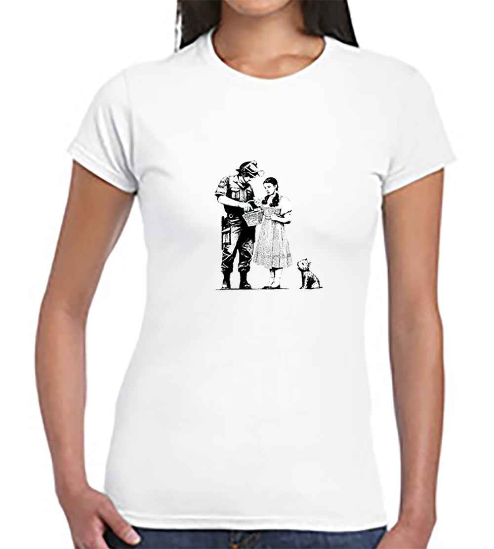 This famous Banksy Wizard of OZ lost Dorothy graffiti image is featured on this cotton t shirt. The design is set on a classic Jersey cotton t-shirt. It's in white in a choice of sizes.