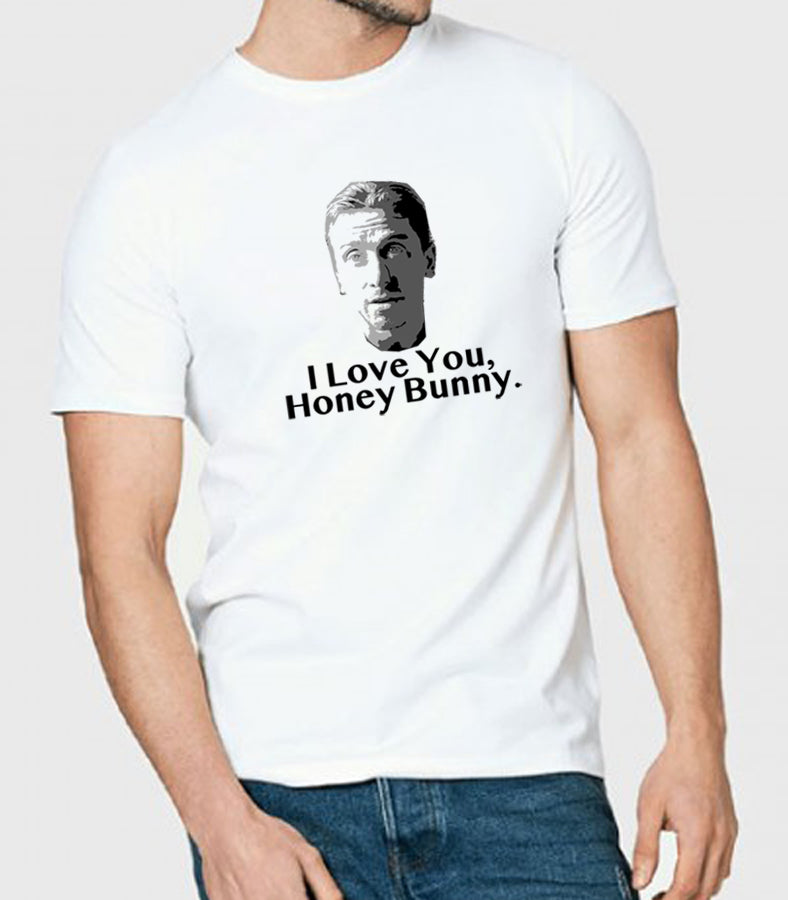 A memorable quote from Tim Roth as Pumpkin in 1994 Pulp Fiction film (I Love You, Honey Bunny.) This quote is set on a classic Jersey cotton t-shirt. It's available in white and in a choice of sizes.