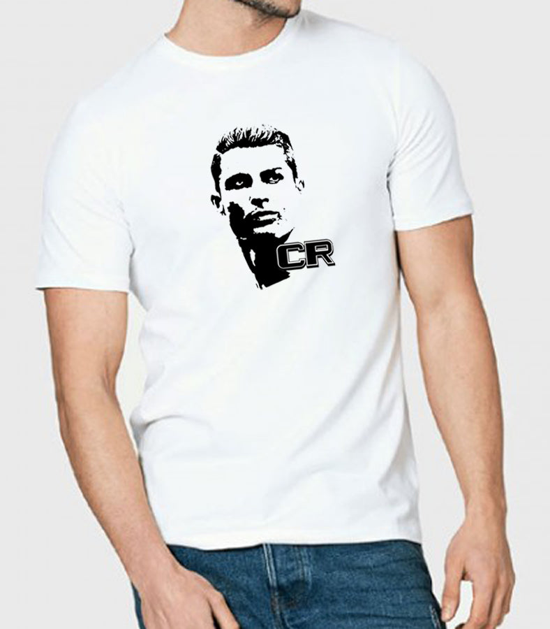 Celebrate one of the world's most popular footballers with this unique design of football/soccer star Ronaldo.The design is set on a classic Jersey cotton t-shirt. in white in a choice of sizes.