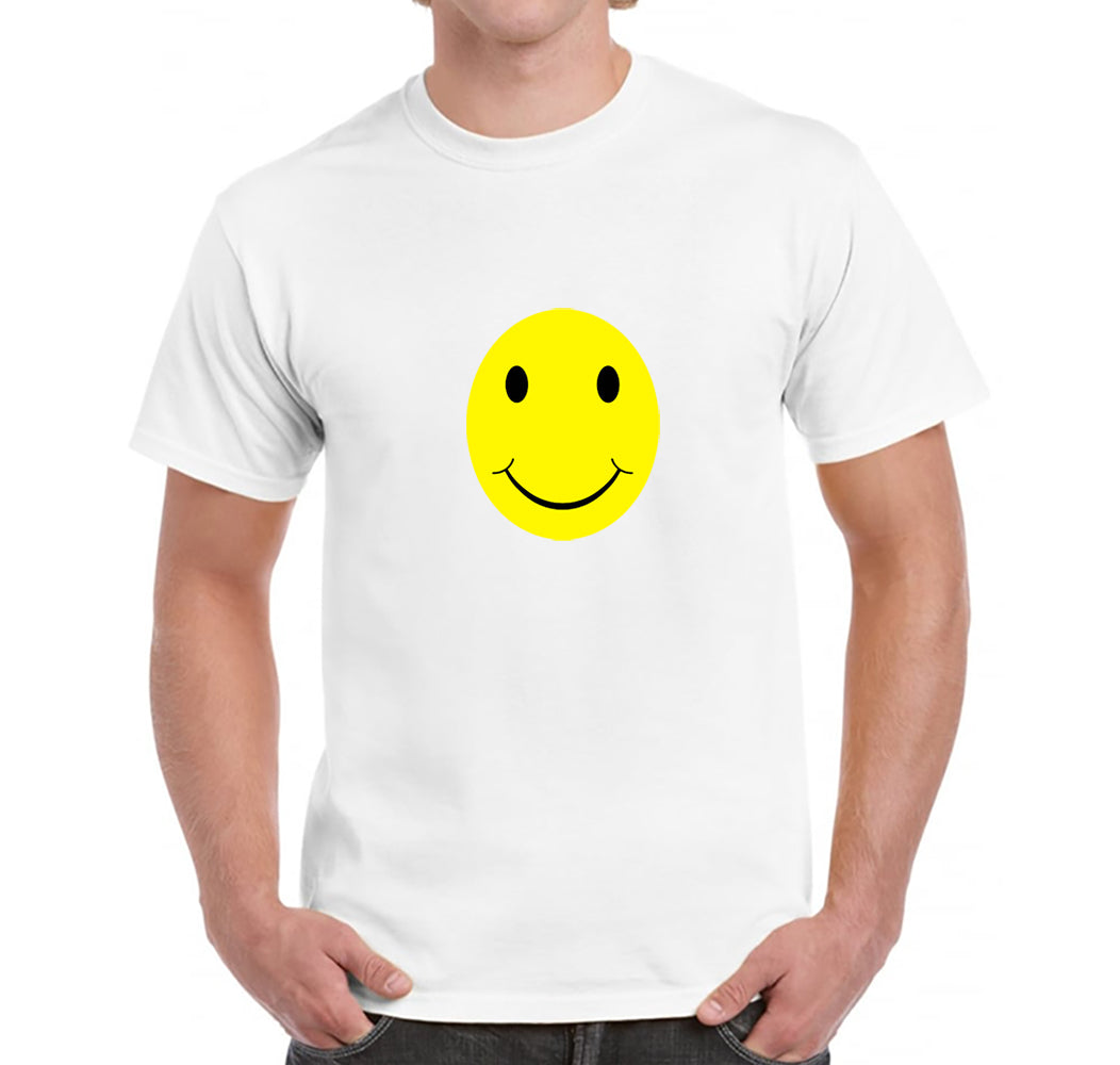 A classic, this smiley face design is featured on this classic white Jersey cotton t-shirt in a choice of sizes.