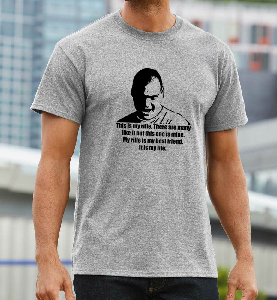 Private Pyle certainly never forgot The Rifleman's Creed, right to the very end. This famous quote from the 1987 Kubrick classic "Full Metal Jacket" is set on a classic Jersey cotton t-shirt. It's available in sports grey and in a choice of sizes.