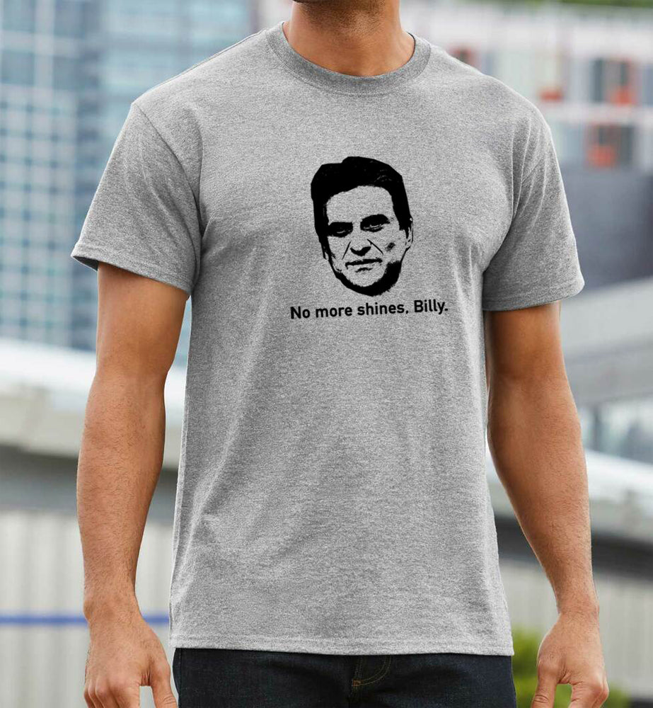 Actor Joe Pesci Goodfellas character Tommy DeVito quote (No more shines, Billy.) This quote is set on a classic Jersey cotton t-shirt. It's available in sports grey and in a choice of sizes.